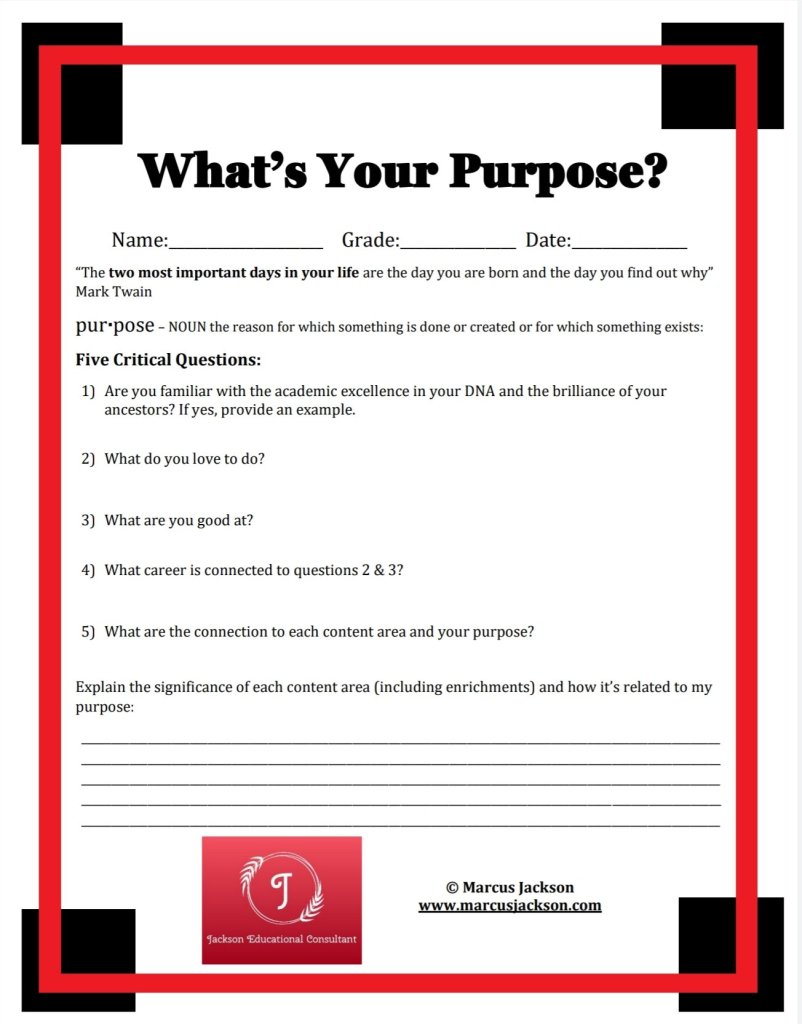 I then provided them with a brief overview of my other books before beginning the next activity. The final activity was the icing on the cake. Students will now discover their P (Purpose). I had everyone’s attention, and each student was eagerly anticipating what was next. Traditionally, we always would ask students what they would like to be when they grow up? This is not only a challenging question for grade-level students but collegiate students as well. Therefore, I no longer ask that question and instead help students discover their purpose and purpose of learning. To achieve this goal, there are critical questions that must be asked.